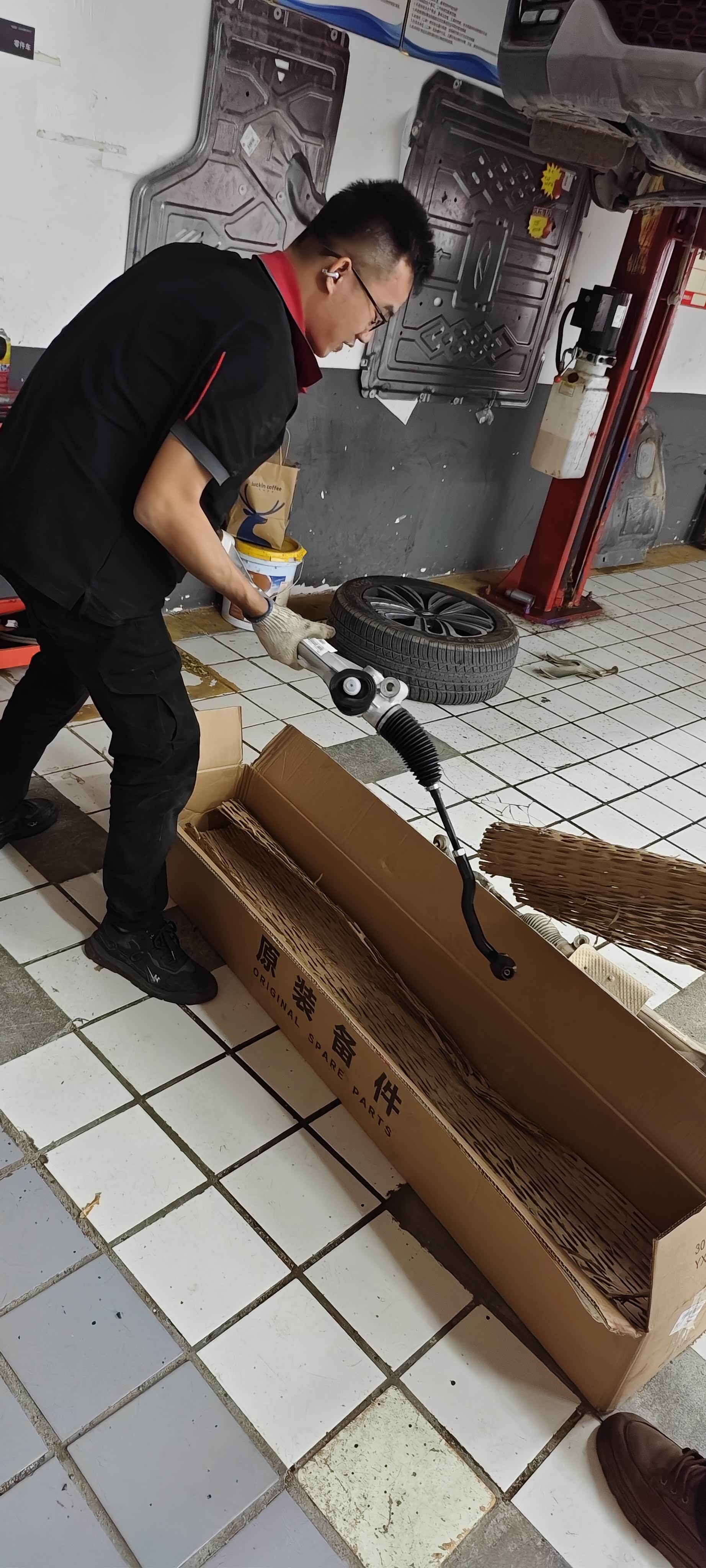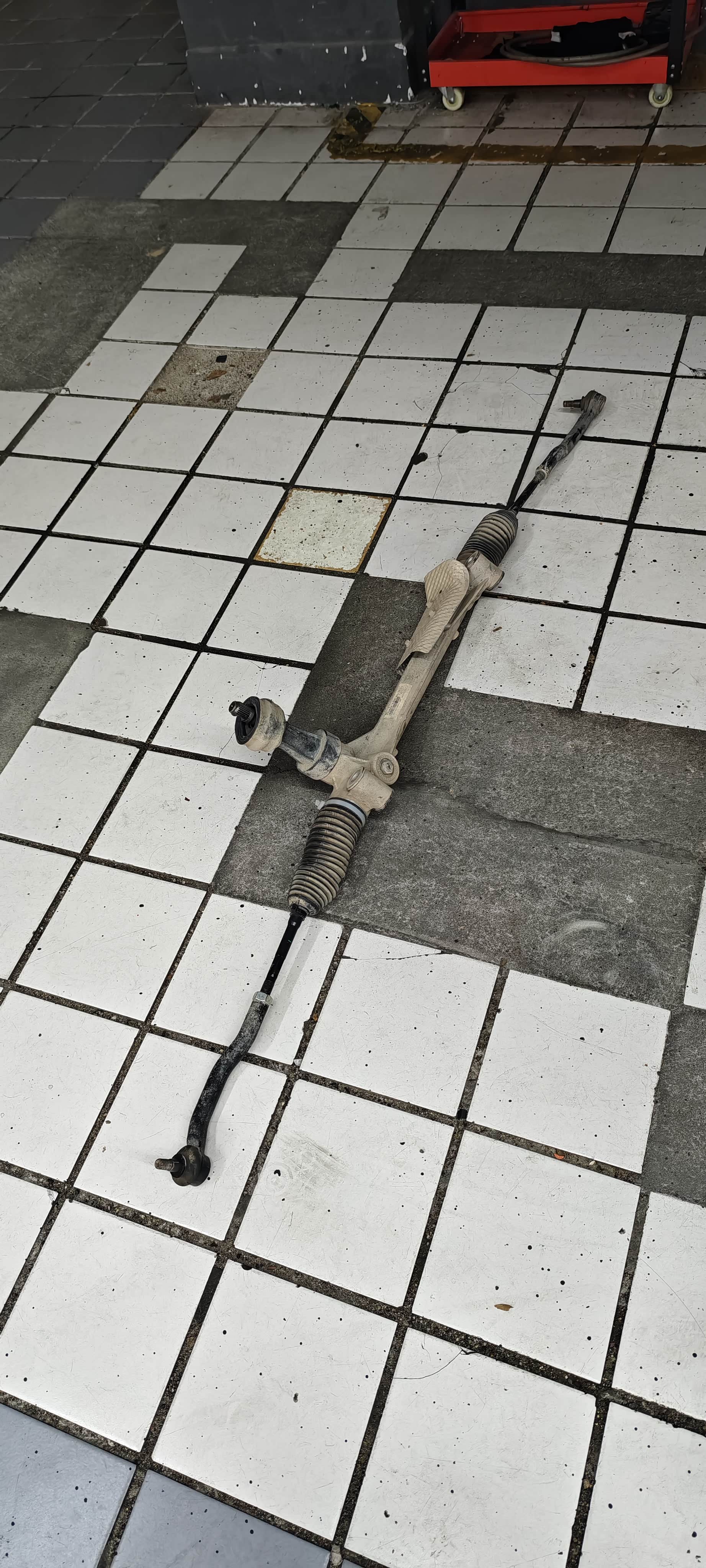 师傅把旧的方向机拆出来了,胶套被我弄坏了,有些渗水,里面有一些生锈,上次来更换球头,师傅说方向机胶套损坏,里面有些生锈,但是不影响使用,因为方向机是机械,不过我这个人有一些洁癖发现有问题就要把它更换掉