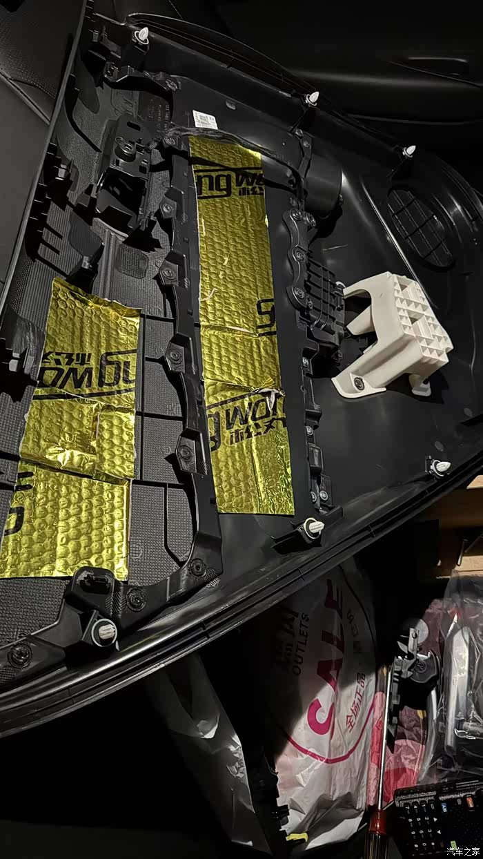 5,前门两个喇叭,旁边有个椭圆空,用胶皮封着,刚好可以穿喇叭线,后门开口较多,不需要单独找穿线位置