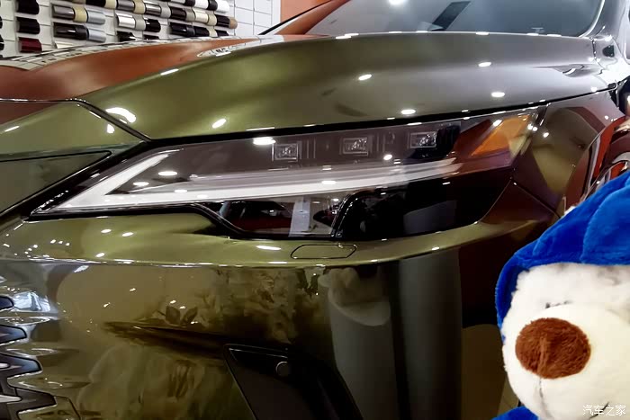 这款车漆叫做超音速流光金属色,在屋顶射灯的映衬下,有点像是军绿色。新款车提供了多达11种的车漆颜色,其中有6种是颜色艳丽的车漆,这在中大型SUV中并不多见。前大灯的样式发生了比较大的变化,下边缘的多边形造型与老款大灯迥异,不过两边灯角的锐利上挑设计,依旧保留了雷克萨斯一直以来的家族特征。