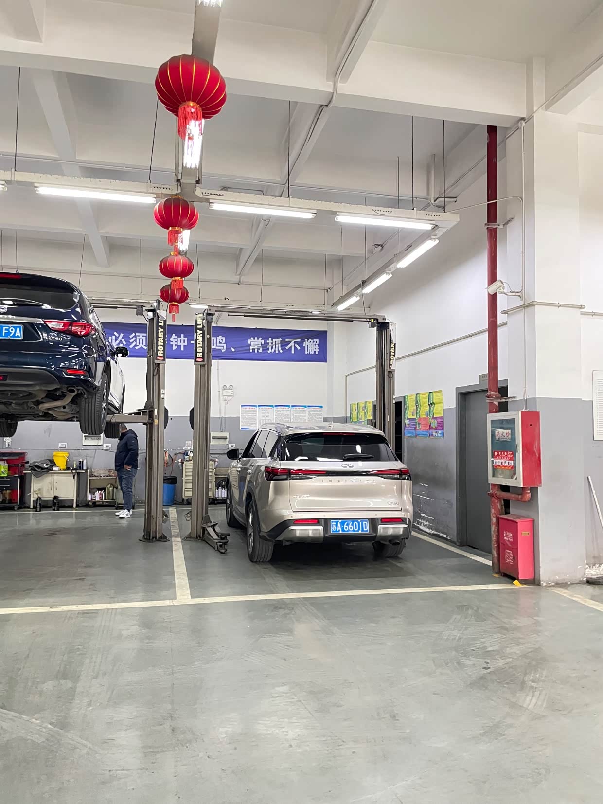 这几天正好有空,准备赶着年前把车保养做了,于是在APP上预约了周三10:30去4S店。当天我准时来到了4S店,工作日的4S店真的很清闲啊,车间里只有3台车,只有上一代的QX60 2.5混动的在架子上施工。休息区里一个人也没有,偌大的店怎么维持啊!