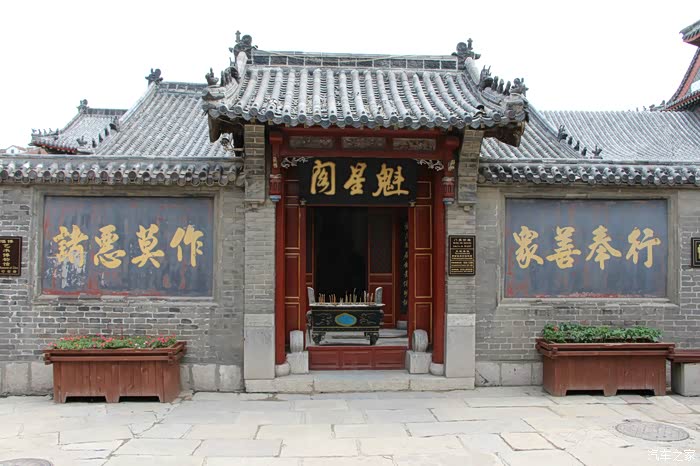 魁星阁。这里十一个字,排列混乱。魁星阁右向左排列,是对的。诸恶莫作众善奉行八个字是左向右,是错的。因为这是竖行排列,应该左向右。只不过这里的一行只有一个字罢了。