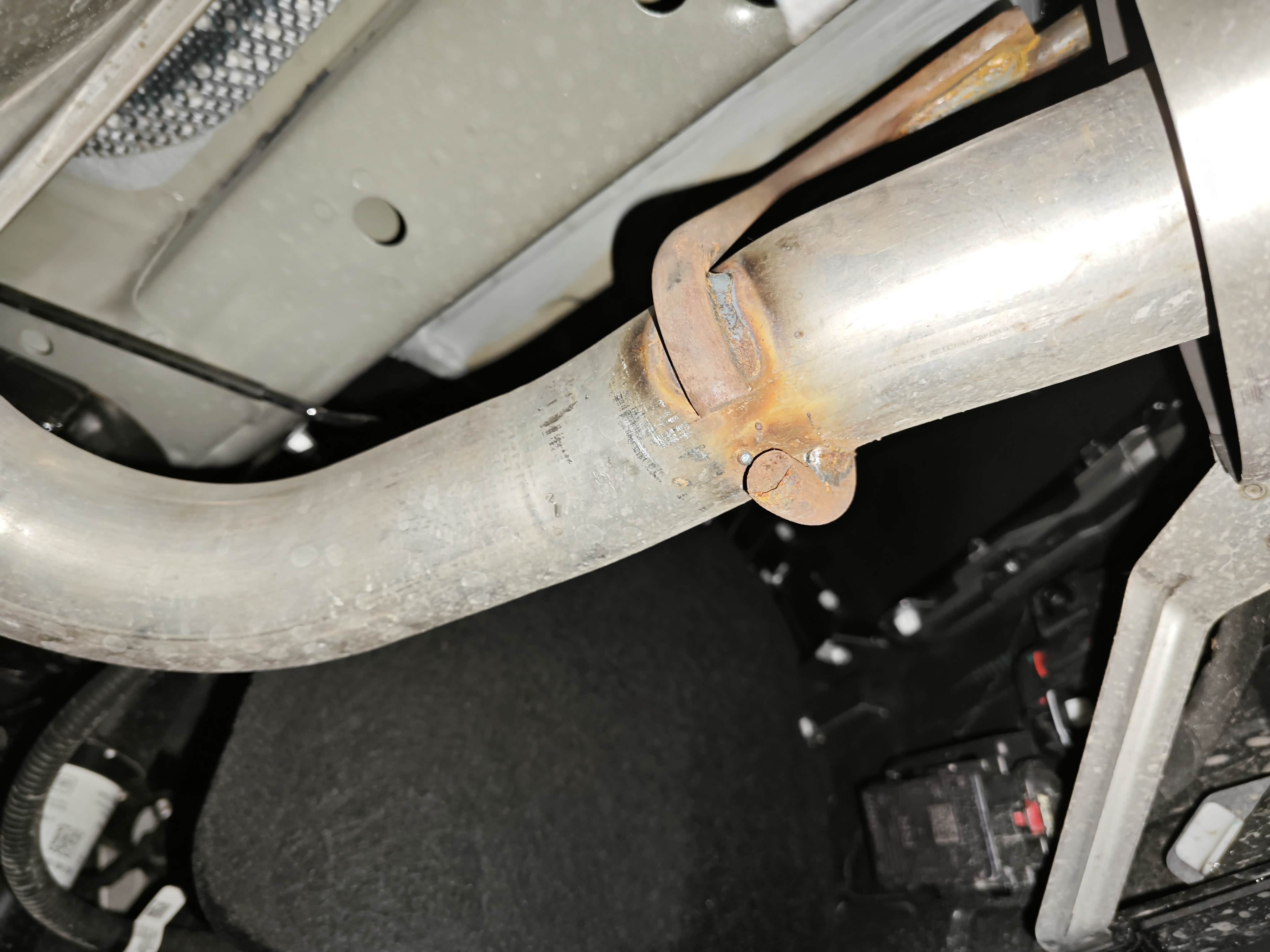 6、美系用料扎实,但做工还是粗糙(图7),底盘没有装甲单元裸露,排气管固定架生锈,网上很多车主有反应,我在1个月时看过就已经绣了,没做防锈处理不能理解,无非就是为了省成本