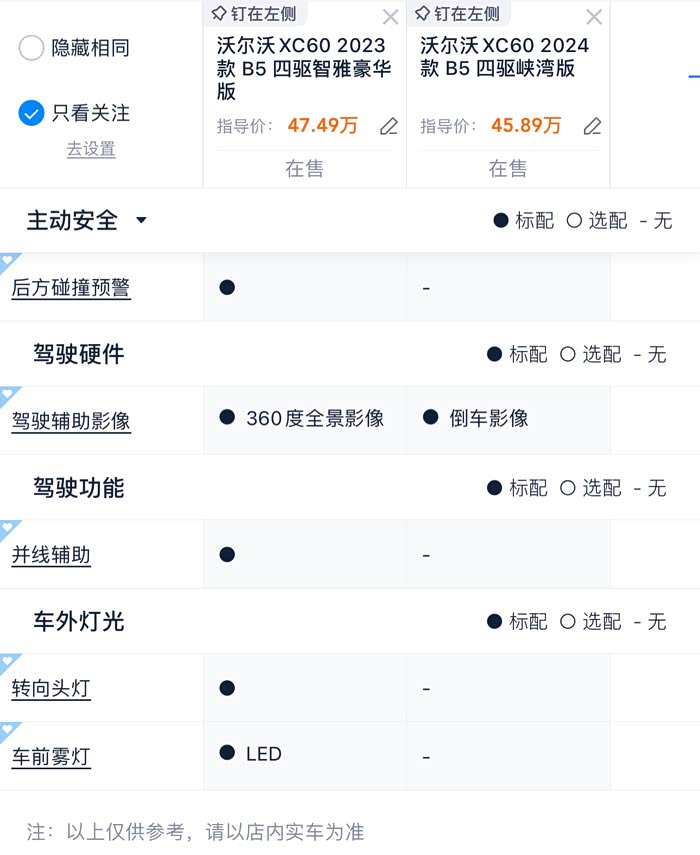 在装360之前销售顾问说老司机一般用不到这个,其实恰恰相反,我想老司机才知道这个东西的重要性。车辆的安全驾驶辅助永远没有尽头,能多一点就多一点,沃尔沃在这一点做的确实很全面。他的citysafety城市道路驾驶安全辅助系统,是目前针对城市道路最优的安全辅助。同时很遗憾,他的这套辅助系统是模块化设计,也就是分等级调用服务。原厂盲点监测并不只是监测,还能给你带来后方碰撞预警,360不只是环视视频,还能给你带来并线辅助,而这两样功能只有智雅版本预装,随着24款智雅取消,已经不复存在。也就是说目前在售后不提供原厂360安装调试途径的情况下,我们永远也买不到具备全功能citysafety的XC60了。
