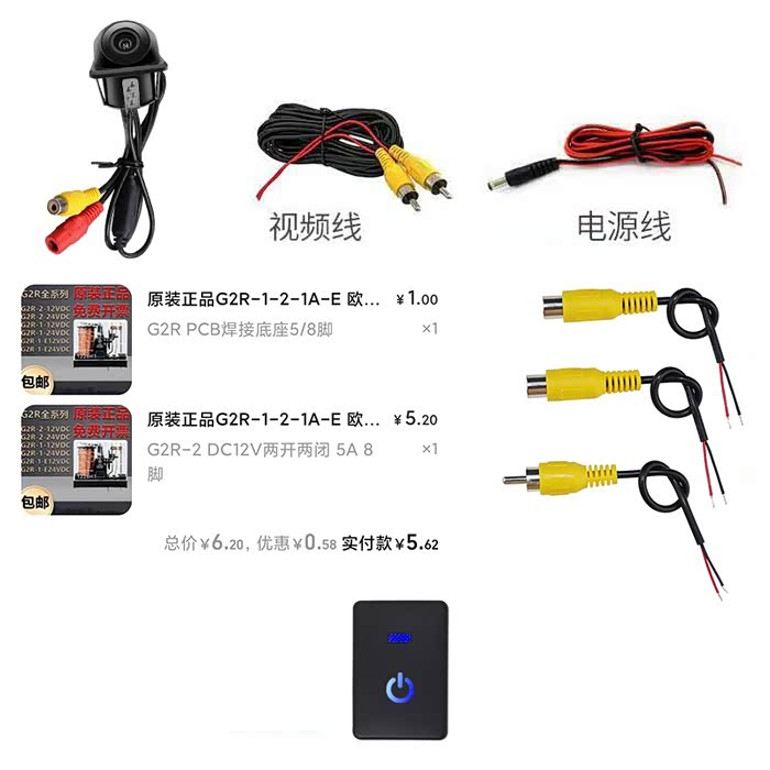 我只买了个右视摄像头,买的是480P的,价格23.5元(要求高的,可以去入手个星光级别的摄像头,就非常清晰),图上面三种是买摄像头送的,还送了个开孔器,继电器5.62元,下面的开关是好心人送的,莲花头家里存的线剪的,总成本不超过30元