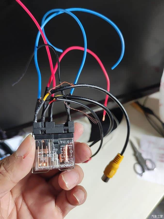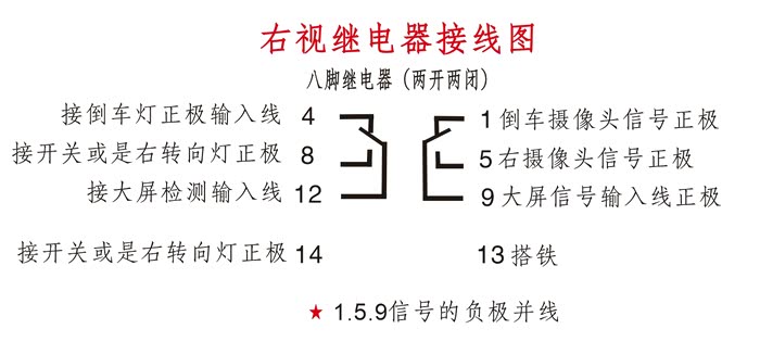 用这个八脚继电器,就不需要去买个视频转换器!这个接法是以右视为主,你右视开启的话,倒车是不显示图像的,只能关了右视,倒车可视才有显示图像,这个接法,你可以像我一样接个开关控制右视,也可以接到右转向灯正极控制右视,你打转向灯,右视图像就会显示出来,这样接有个弊端,你听音乐听到一半,一打转向灯,音乐就没有了,像常变道的,这音乐是没法听了。14是继电器的正极,13是继电器的负极搭铁