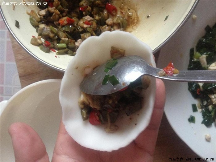 在做好皮子后,放入不同的陷,这个是茄子辣椒的。江西人喜欢吃辣,这个味道最受欢迎。