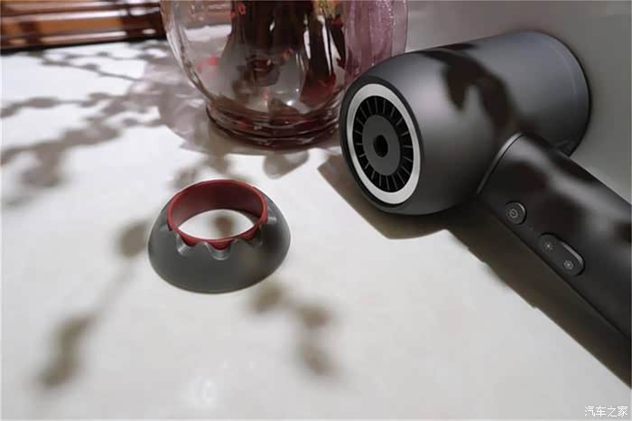 在进风口也设计的非常新颖,配以红色的设计,使得灰红两种颜色能够更加的融合,同时进风口也采用了蜂巢式进风网,即灵动又有型,更能够有效的防止头发的卷入。