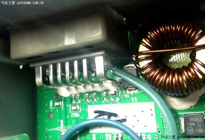 功放主机板。图中左侧就是刚才提到的功放芯片TDA7388A 4*41,由两个螺丝和散热铁片保护的集成块就是。