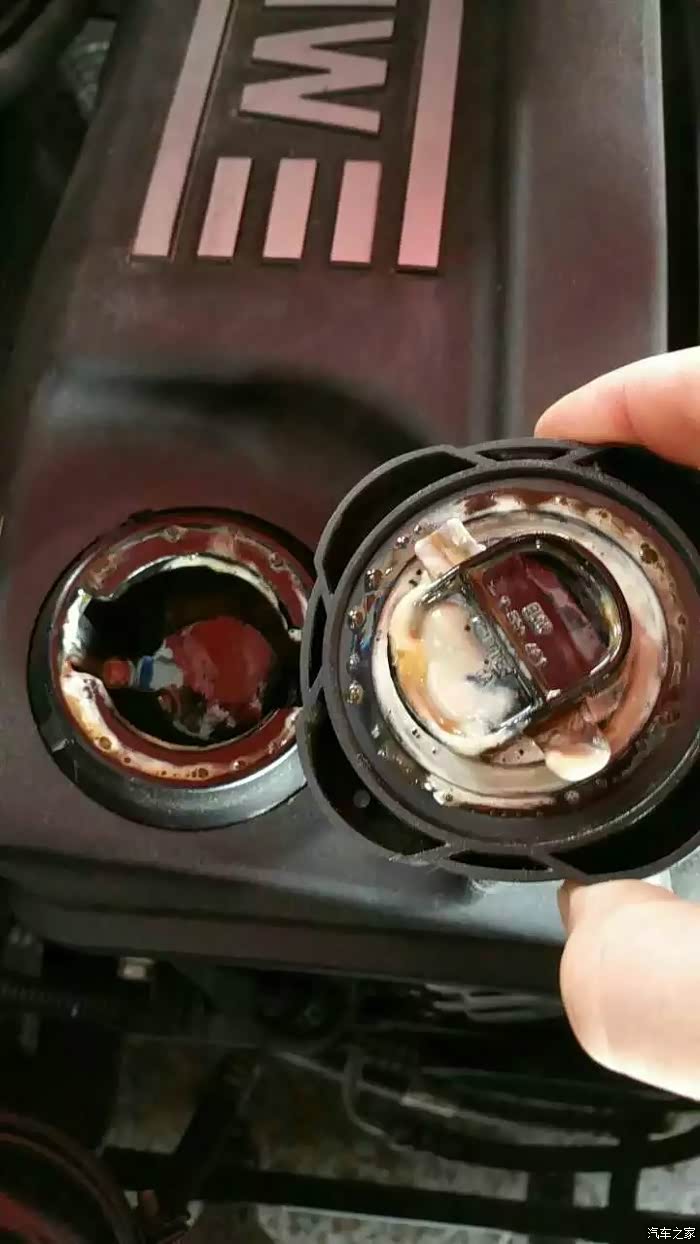 接下来就是重点了:我们准备直接用干净桶子把油放出来测量,结果打开加机油盖和机油口一看一层厚厚的乳白色,机油也差了1L,内心是比较震惊的
