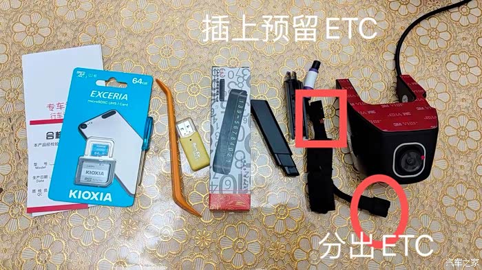图示为凯路德C1记录仪主机,附带的ETC插头,一头插上车内预留接口,另一头分出接口,如果再安装ETC取电就不影响。主机是3M胶粘贴,用的铠侠高速卡,这个是东芝卡质量还可以。
