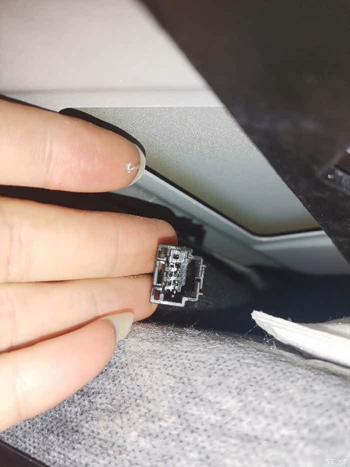 宋plus dmi把阅读灯面板拿下来,右上角位置直接可以看到个黑色包裹的,拉出来就是预留接口,这个是12V,安装专车专用的记录仪是一样的电压,直接插上就行。