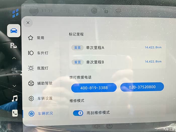 第二步:在车机系统中打开雨刮维修模式(在车辆状况界面往上翻就能看到,或者直接语音叫小P帮忙),打卡这个模式以后,雨刮就会摆动到主驾前档玻璃的位置,方便接下来的工作。