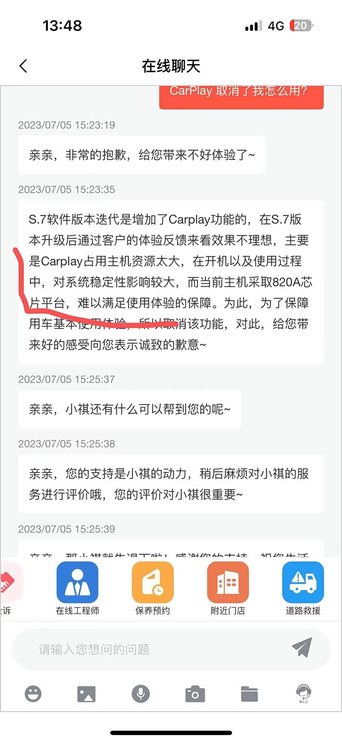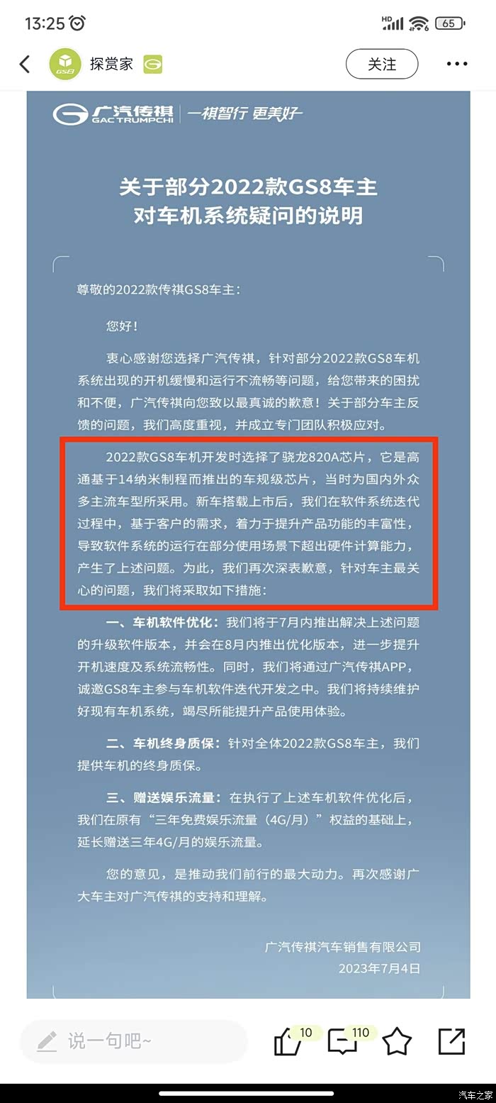 三、7月4日广汽发表说明称:2022款GS8车机开发时选择了骁龙820A芯片,软件系统的运行在部分使用场景下超出硬件计算能力。要优化升级软件版本。也就是说广汽自己已经承认了820A带不动目前的车机系统。最近又爆出广汽客服回答的主要是Carplay占用主机资源太大需要取消该功能来确保车机体验。客服没有上面许可我相信是不会私自乱说的吧。那广汽是要通过阉割目前的版本来优化车机嘛?拭目以待。