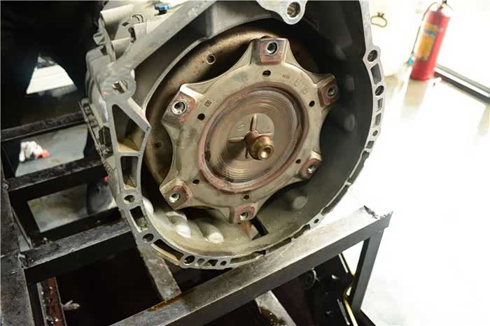 维修经过:车开到店里,故障灯就提示变速箱故障,关车重启还是有提示,维修技师需要试车检测,发现发动机转速已经很高了,但是车速就是提升不了,(车加速无力,明显有打滑现象)并伴随着金属摩擦声,连接汽修电脑读取故障码,确定故障为变扭器故障,需要对变扭器镜像拆卸维修。