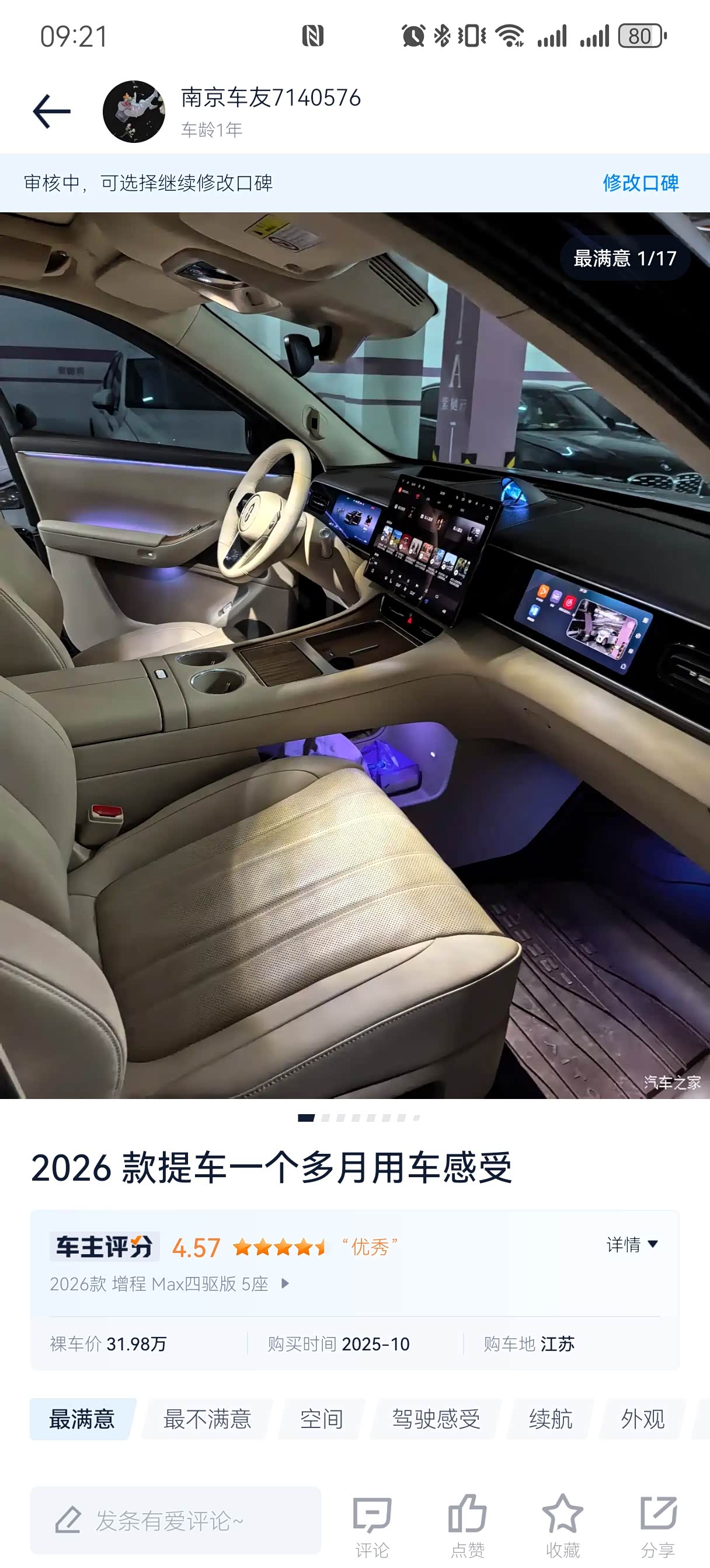 4,要说不太满意的就是落地价七七八八超了预期,智驾包额外 1 万 2,延保 8000 多,保险 9000,落地干到了 35 了。心疼
