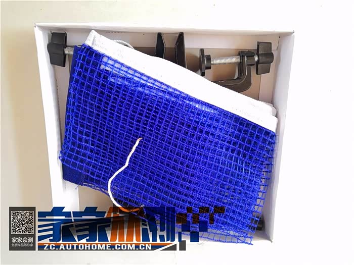 打开包装盒,看到了一款比较熟悉的乒乓球球网,蓝色的网体,顶部是白色的细长条