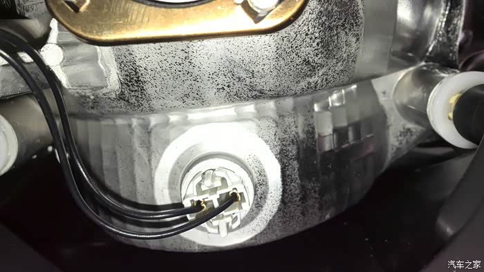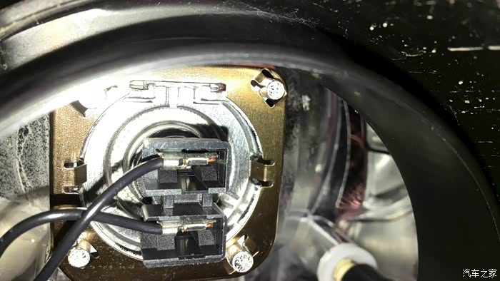 盖子里面是个短圆筒,里面什么样,用眼基本看不着,角度不对而且前面还有其他部件挡着,所以拿出手机拍了再仔细看吧。手机也是盲拍,拍了好多张才能有一张看着比较清楚的:里面上边是近光灯,下边是示宽灯。近光灯最外边露着的是个2根黑线连着的黑色电插头。这个插头比较好拔,没有卡子,直接拔下来就行了,线不长,拔下来拨到一边别碍事。
