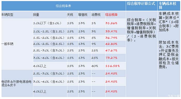 入境税收:中国进口商品目前征收,海关关税,消费税,增值税三种;其中关税目前为15%;增值税为13%;消费税根据汽车排量不同从1%到40%不等;入境税收=车辆到港价*汇率*综合税率;综合税率及消费税税率见下表;