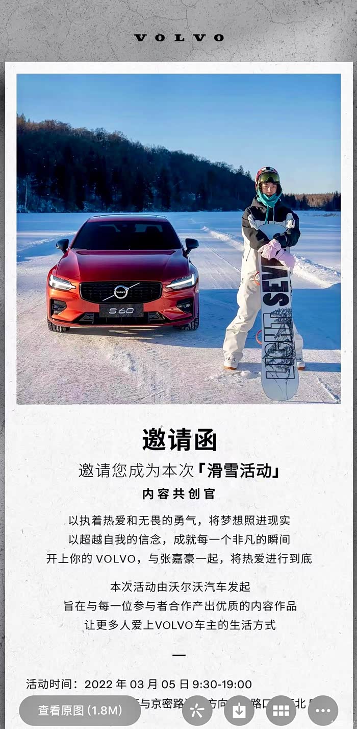 2月底的一天,收到沃尔沃官方邀请,与全国滑雪冠军张嘉豪一起滑雪