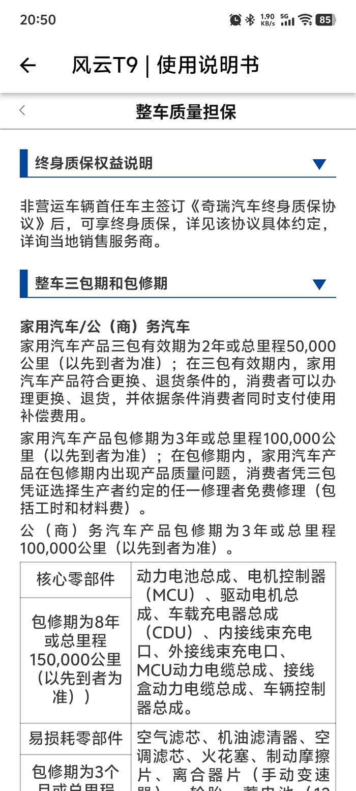 保养政策:奇瑞的新能源系列车型,主要是风云系列或者带CDM的车型。首保是6个月或者5000公里,先符合哪个条件就去保养,后续的保养政策是混动里程10000公里(纯电续航不算)或者1年一次保养,每次费用600-700元左右。三电系统和底盘,发动机,油漆,变速箱之类的大件是终身质保的。这个保养政策可以打消很多人,觉得混动车型保养费会很贵的谣言吧。