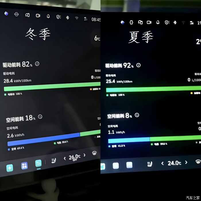 平时上下班通勤也比较多,我们这冬季早晚出勤时候的温度一般在3~4摄氏度左右,原先夏秋两季不管开不开空调充电90%表显纯电续航153km是完全够用两天往返的(之前有测过2天通勤145km剩余10%电量),到了冬季随着气温低对电池的影响外,开方向盘加热、座椅加热、暖风空调这些取暖需求明显会增加空间能耗大概多了10%,如果仍然按照之前90%的电量用两天,那第二天下班回家的时候肯定是需要开启混动模式,整体车辆能耗数据大概:夏天开空调整车能耗23kwh/100km左右,冬天基本上整车能耗都在29kwh/100km左右。按照我们这冬季气温水平,纯电续航较之前打个八折的表现还是比较满意的。