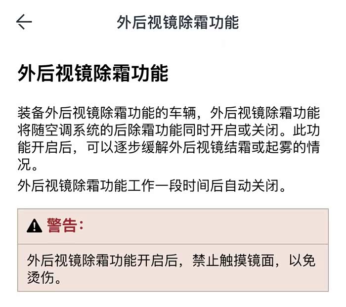 天气冷下雨湿度大可以开前挡除雾和后玻璃除雾,在后玻璃除雾开启同时后视镜加热也自动打开了,它和后玻璃的开关集成一起的,需要注意的是这个功能是会自动关闭的,如果长途持续雨水需要根据情况再次开启,我看电子说明书写的是工作一段时间后自动关闭,我没测试过具体多久它会自动关闭,按照用了几次的感觉应该是在10-15分钟的样子就会关闭。