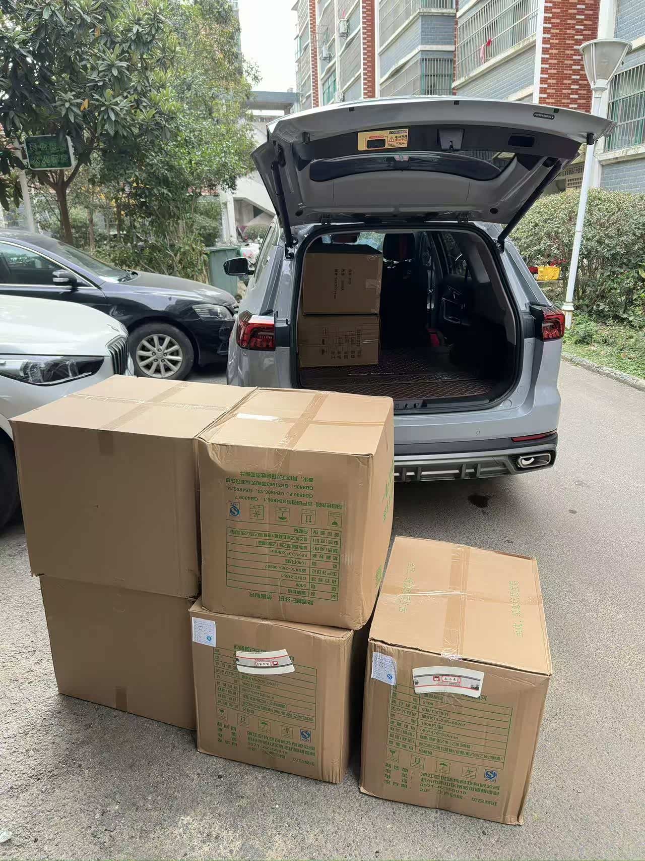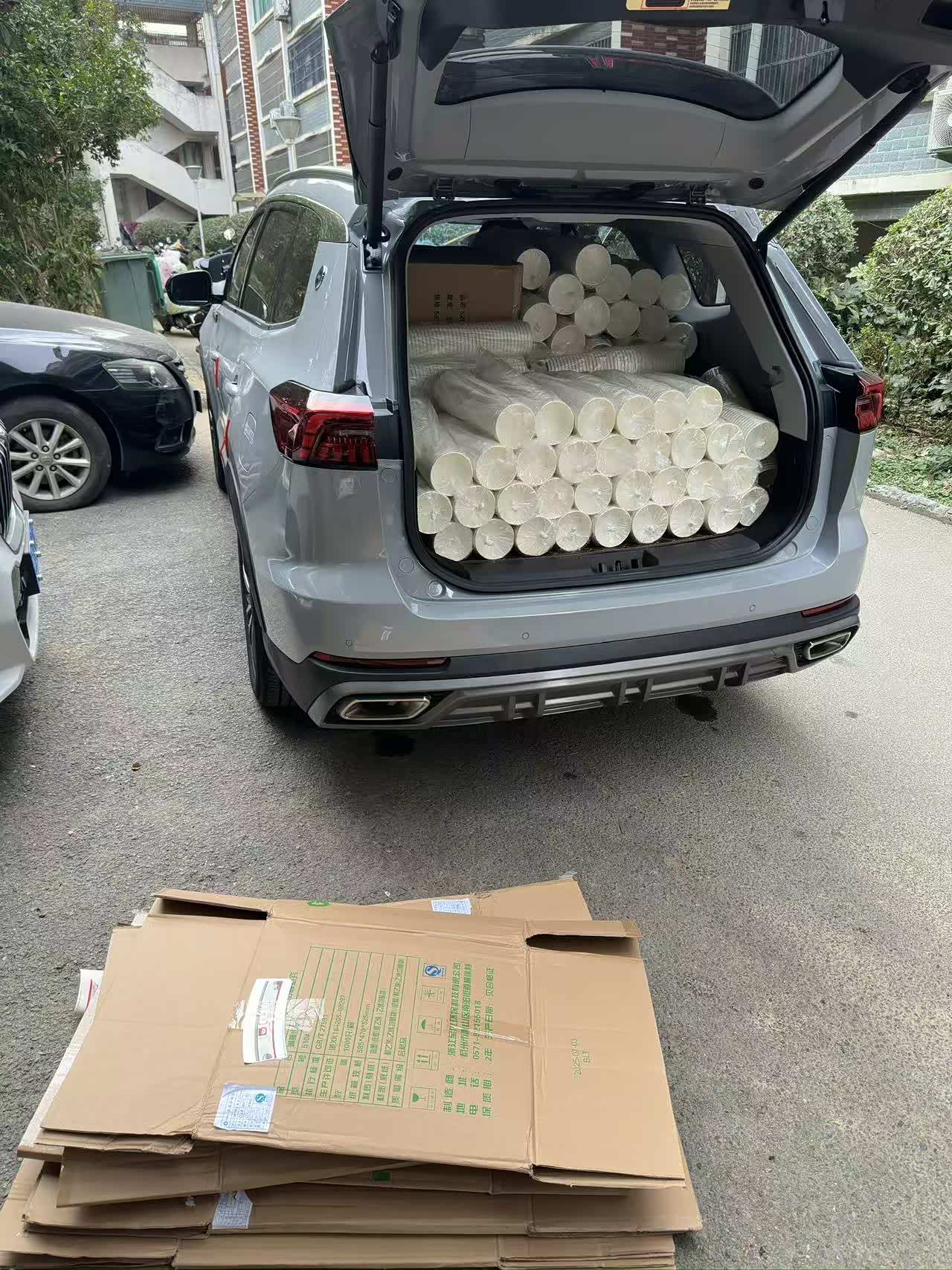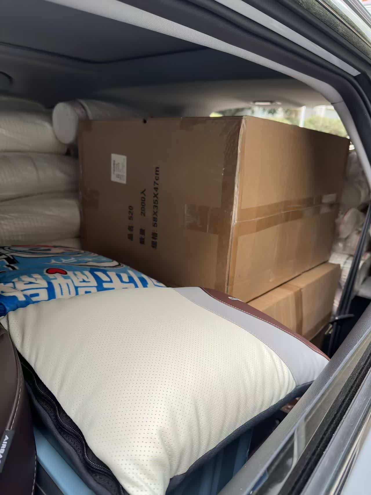 前几天去仓库拉打包盒,一共8件,分三种尺寸:最大的是80x60x50cm,还有60x50x50cm和60×40x50cm的,拆开了体积还是不变的。我先把最把最小的60x40x50cm盒子填进里面。剩下的全部拆开包装码好。8件货摆得整整齐齐,最后空间还很大,又加了一件。关后备箱门的时候一点不费劲,更惊喜的是,车厢里还剩了一小块空地。