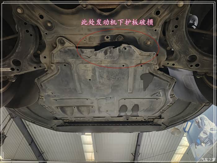 更换发动机下护板原因: 前几天晚上驾车时遇上道路维修,地面凹凸不平且有坑,车 速稍微快了点,遇上坑面时刹车不急,直接硬开过去的,当时也没太在意,但在这几天驾驶车辆时明显感觉到底盘位置有“哒哒哒”异响,车速越快响声越大,于是乎我就联想到是不是前几天晚上过颠簸路面时造成的底盘部件受损造成的异响问题,带着这个“哒哒哒”异响问题进店检查。