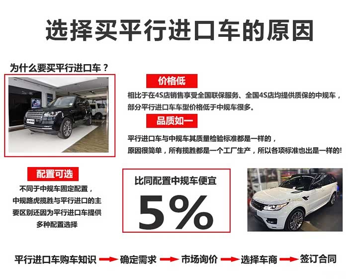 平行进口车优势:配置灵活、价格便宜、质检标准与中规车一致,不同于中规车固定配置,中规路虎揽胜与平行进口的主要区别还因为平行进口车提供多种配置选择,也成为很多用户选择平行进口车的原因。