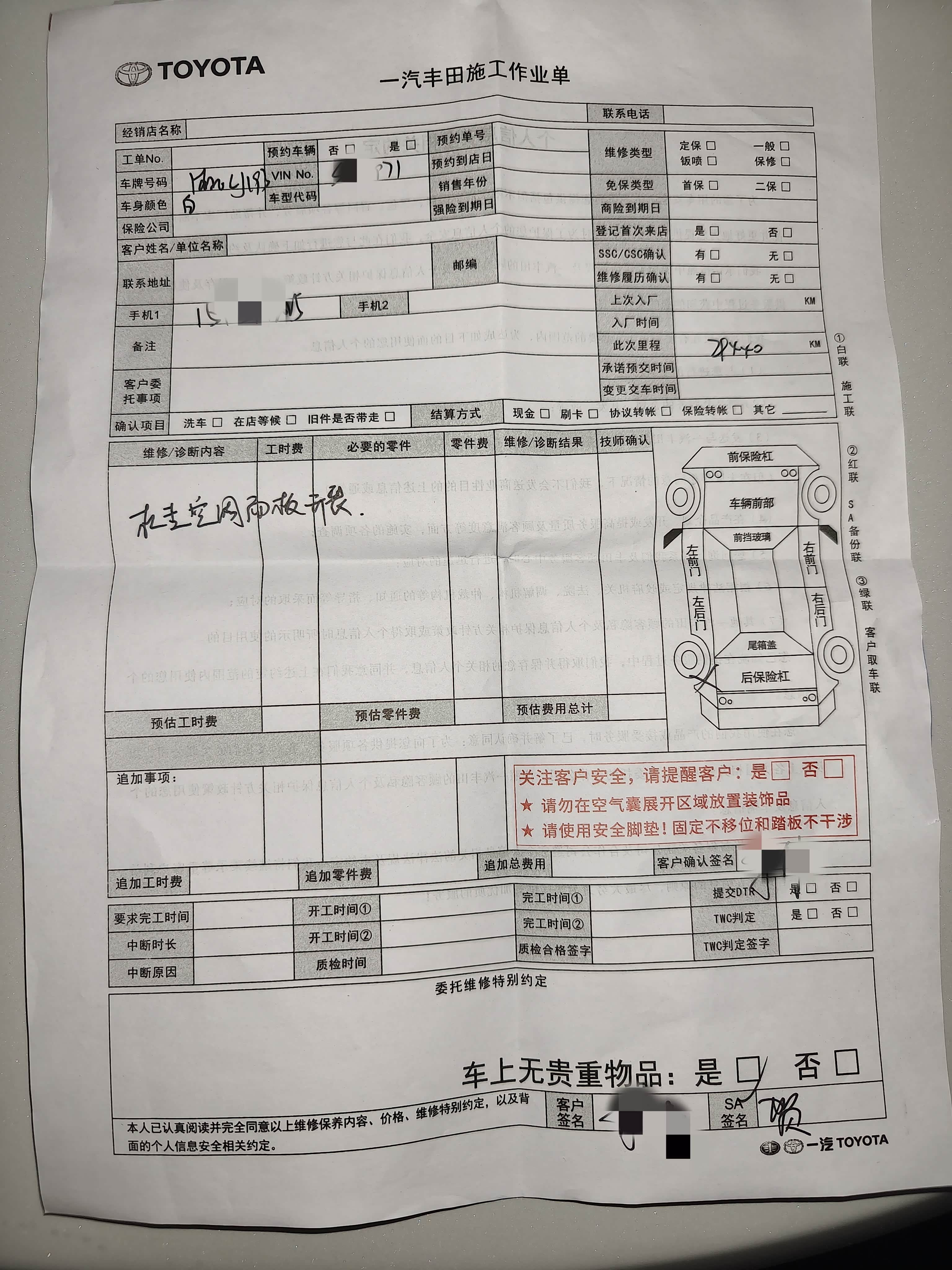 出于对此前一汽丰田售后流程的糟心体验,在最后签字的时候我再次向售后小姐姐表达了更换之后的配件是否质保、质保期是多长时间的疑问。售后小姐姐当着我的面跟另一位专门负责这块问题解答的人打电话,把我的疑虑向那位经理转达。得到的答复是:如果是自己更换的纯牌配件,享受一年2万公里的质保,但是通过售后保修的配件,随整车质保期享受质保!至此,维权的路跌跌撞撞的走完了。