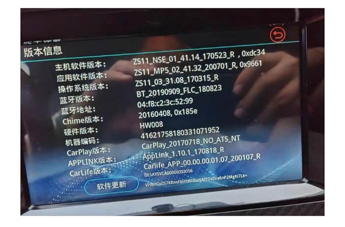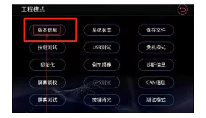 然后进入工程模式,方法:点火启动,将音量调到10,按住音量旋钮键两边的按键数秒即可。进去后点击“版本信息”,