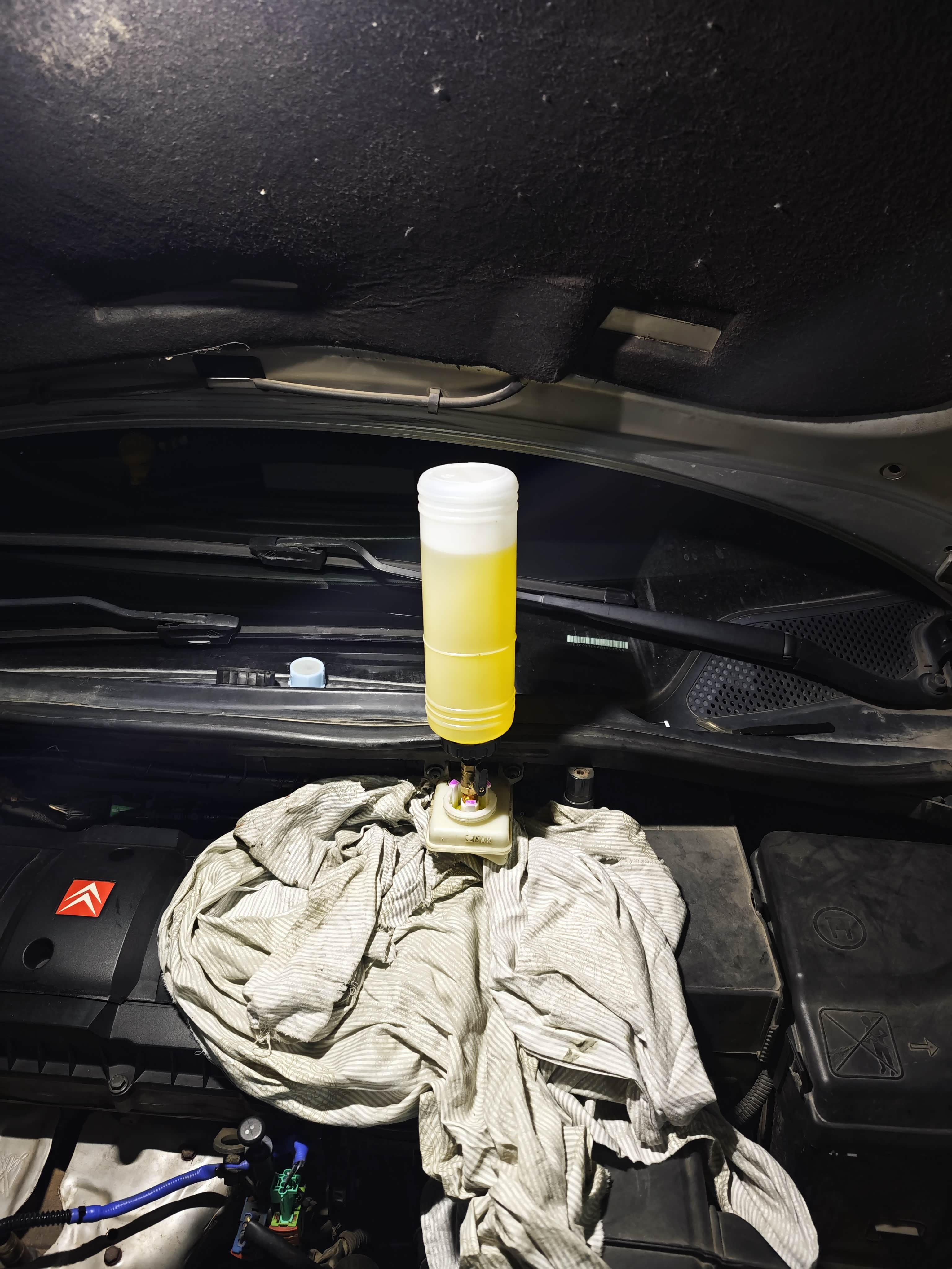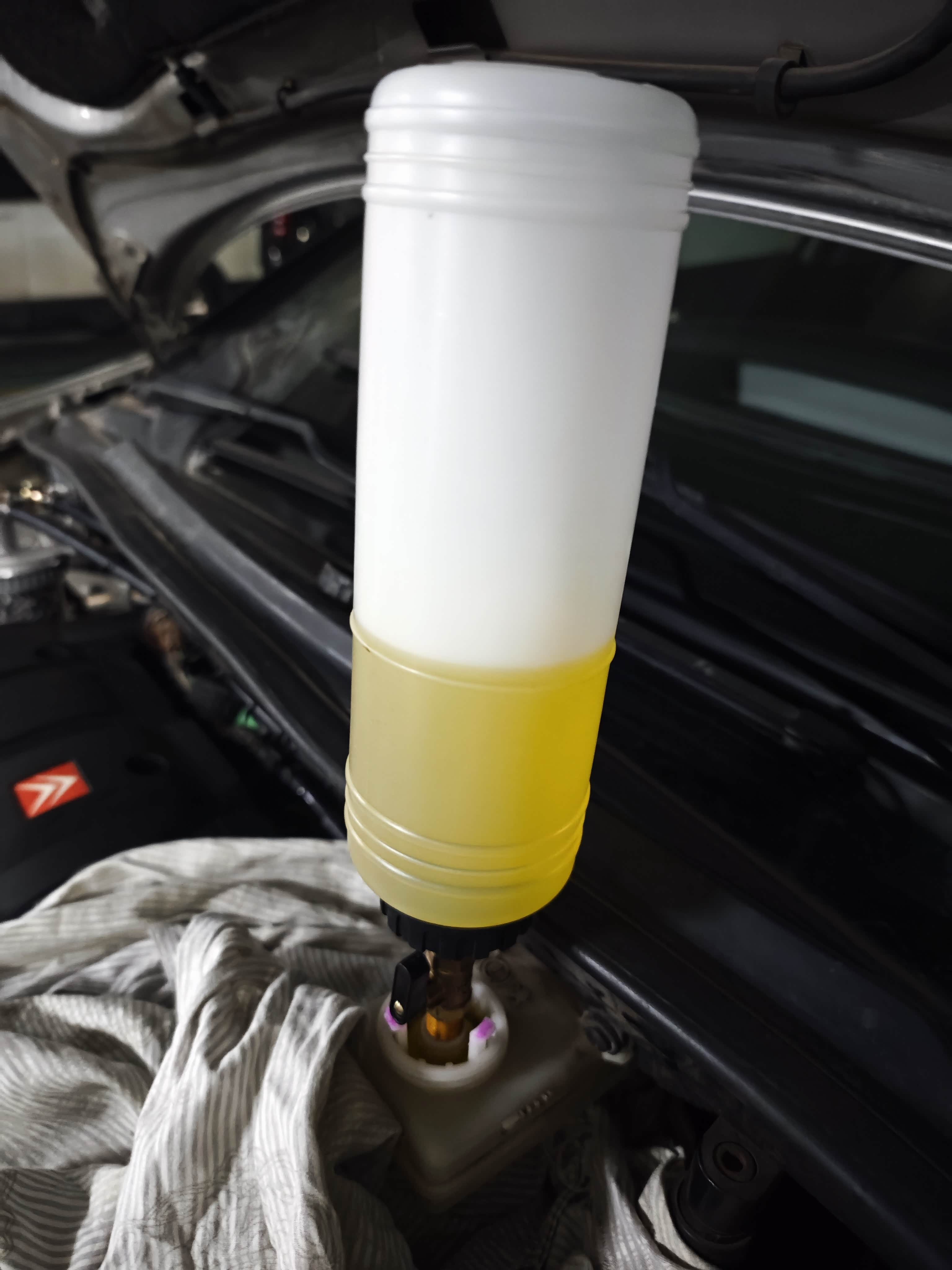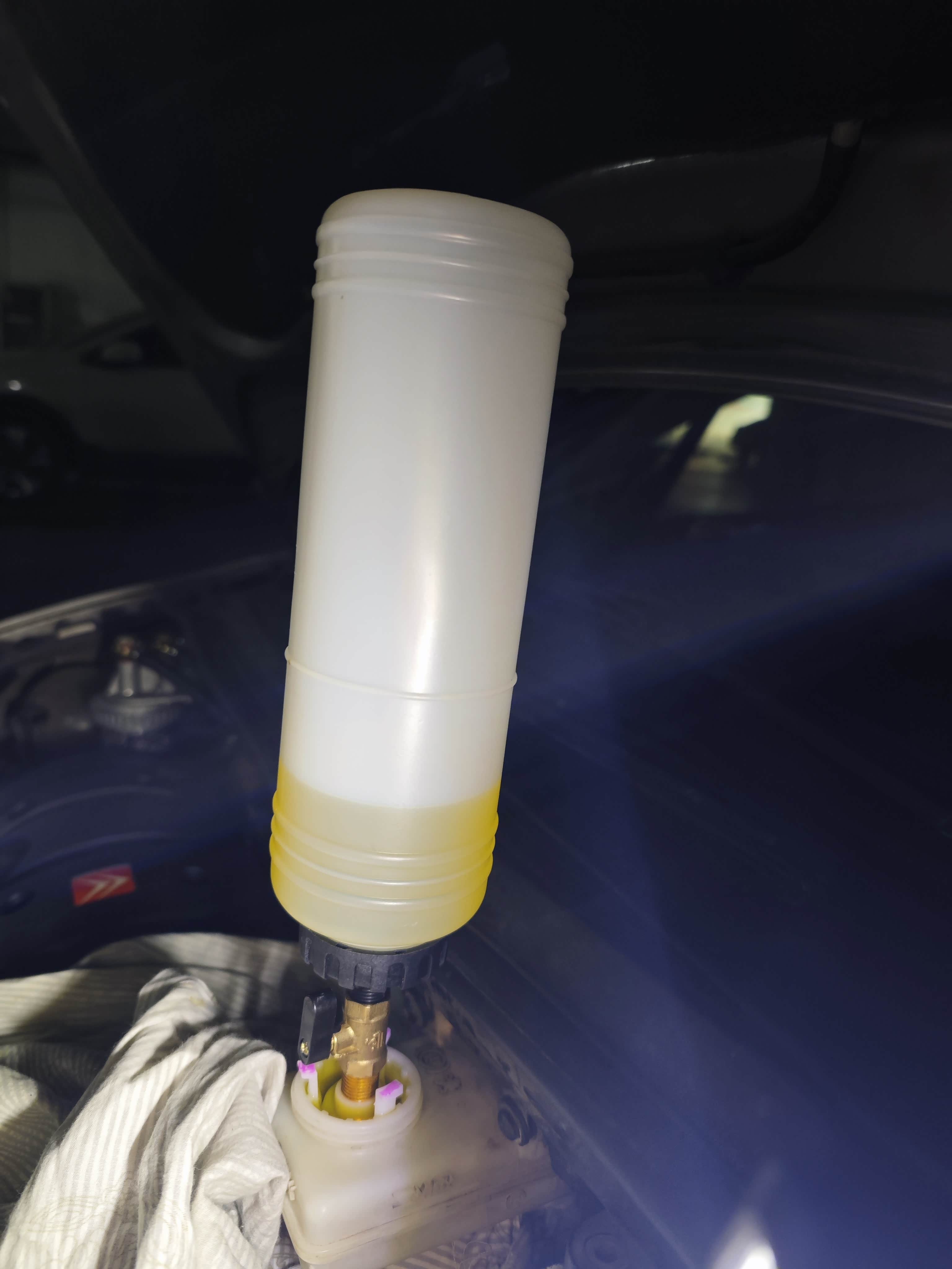 将近7万公里没换刹车油了,今天尝试自己换刹车油,全程一个人搞的,又是在地库打着手电筒,还是很麻烦,右后轮那边千斤顶顶起,钻车底接管子拧螺丝,然后又上去踩刹车,还得关注油壶,买的那自动出油的壶阀门孔径小了,根本不会自动出油,还得手动去挤压。我一开始以为自动出油,后来一直发现没动静,只能用手动挤压,不知道进了空气没有。