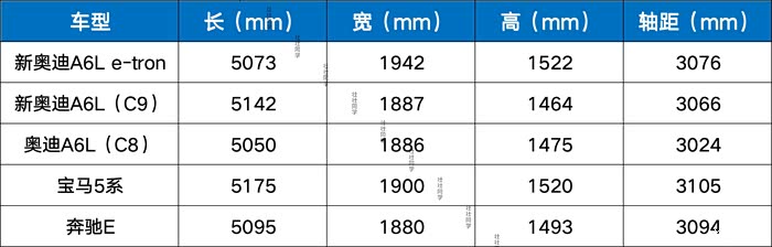 纯电A6L长宽高,车长超过5米,车宽接近2米,轴距超过3米,这几款都是妥妥的中大型C级车。