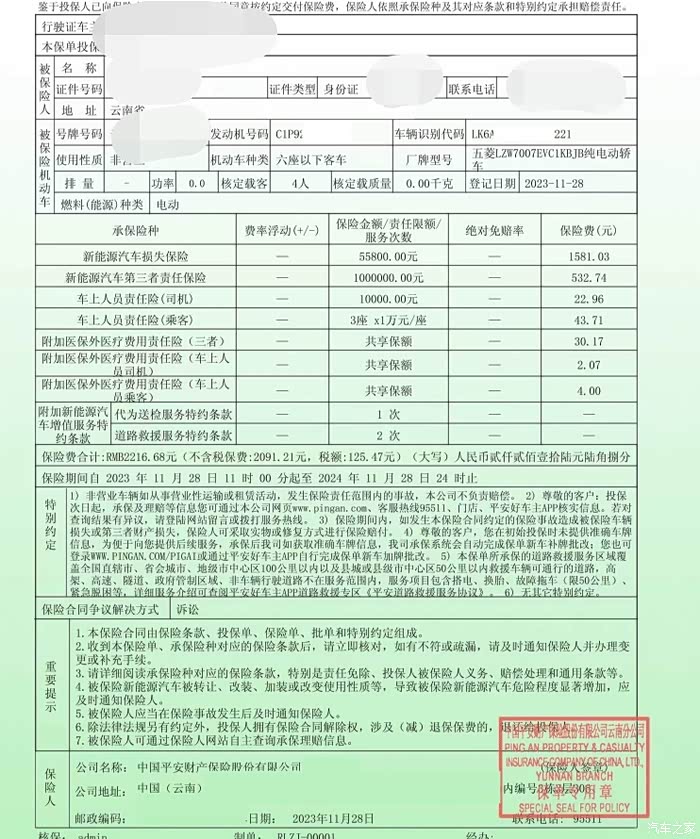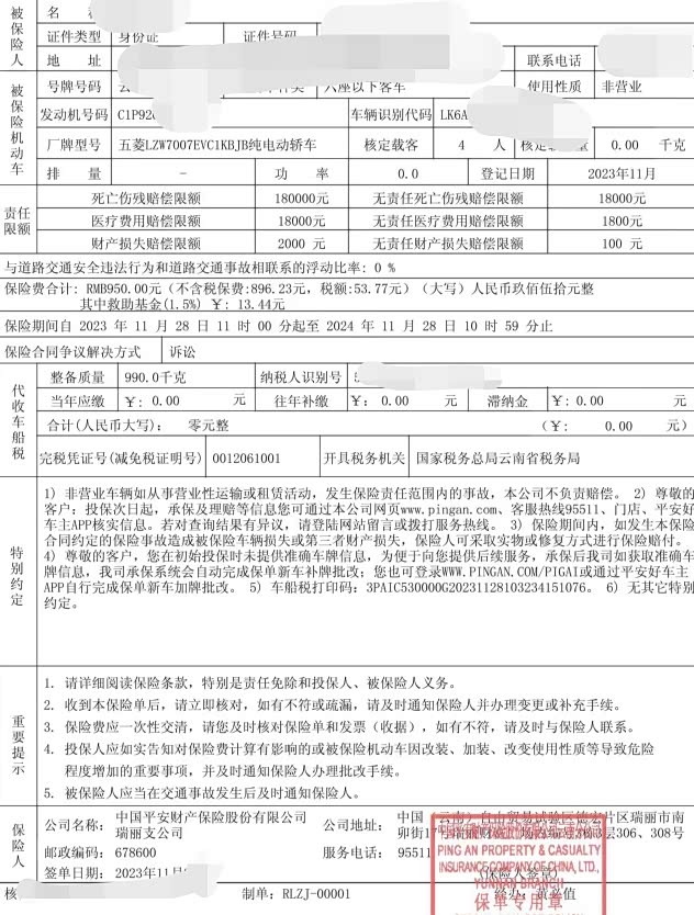 我的五菱缤果第一年保费