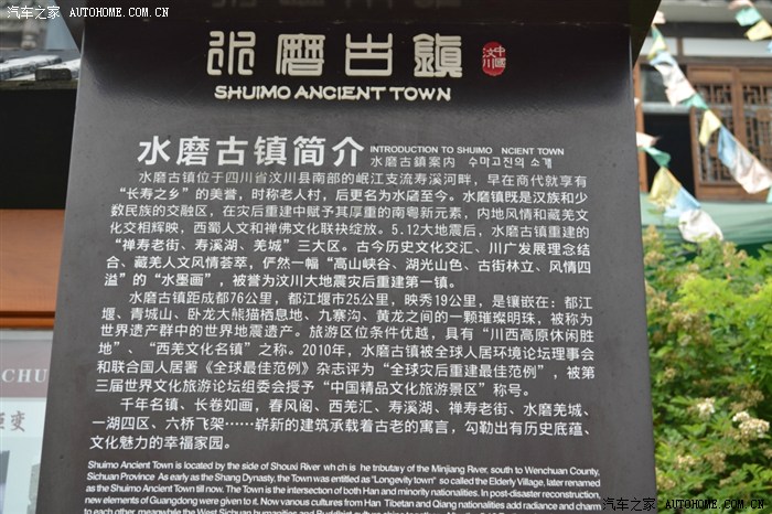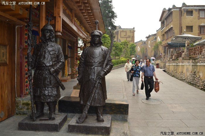 出行三天来,今天行车最少,但是走的路是最多的一天,主要去了古镇水磨羌城和都江堰景区,晚上回到市内直接去了著名的“蜀西第一街”锦里。昨晚更贴到十一点半,今天睡到自然醒,吃过早饭已经是上午九点钟,首先设定导航去水磨羌城。路线是,在成都文家场上绕城高速转G42成灌高速在映秀出高速,再走国道G213/317到古镇,游览具有浓郁西羌民族特色的“西羌名城,文化古镇”---水磨羌城,明代的古戏台——万年台、清代的---大夫第,及名称取自唐代诗人王之涣的名句“羌笛何须怨杨柳,春风不度玉门关”---春风阁,水磨羌城街道两旁的风情展示馆,阿坝州13个县的自然景色、风土人情、历史文化等尽览眼底,可以说,来成都到这里看看走走还是很值得的。