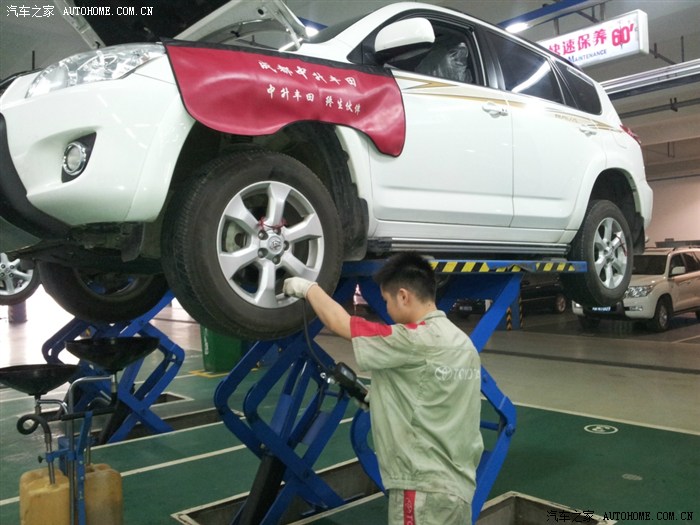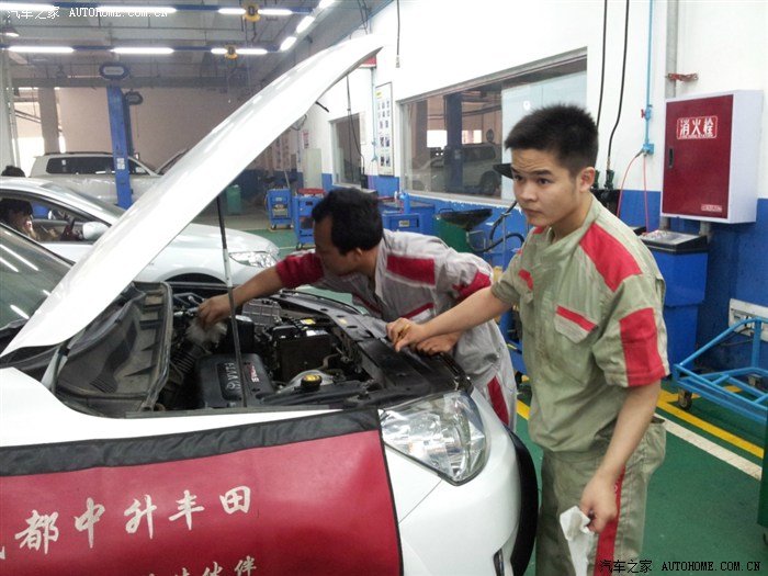 今天早晨在网上首先查询一汽丰田4s店,发现成都有5家店,并电话联系到成都中升丰田店,驱车前去做了例行检查和更换机油、机滤,四轮胎压统一到了2.3kg∕cm2。这里的工作人员很认真,服务太度很好,在此谢谢他们。