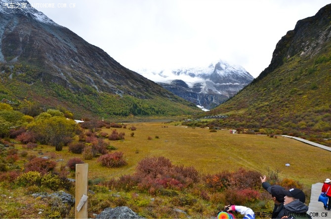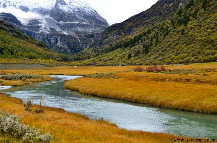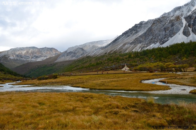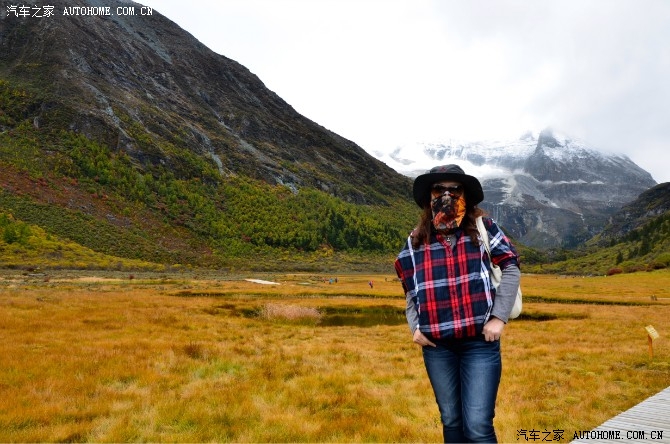 再次乘坐电瓶车上山,票价80元/人,经过大约十分钟左右我们到达海拨4180米的洛绒牛场,眼前呈现出一大片的金黄色的平原,在平原的后面是另一座亚丁的守护神“央迈勇”。