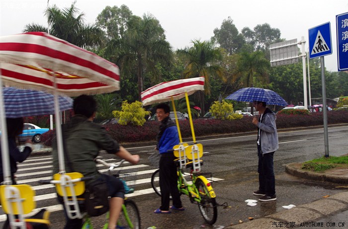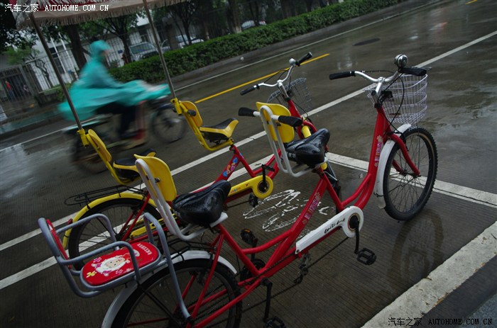 (租车的地方很多,不过价钱不一。最便宜的是10元/小时,但是那里没有既遮雨有能带小孩的自行车,只好租了25元/小时的(开口30元)。。。)