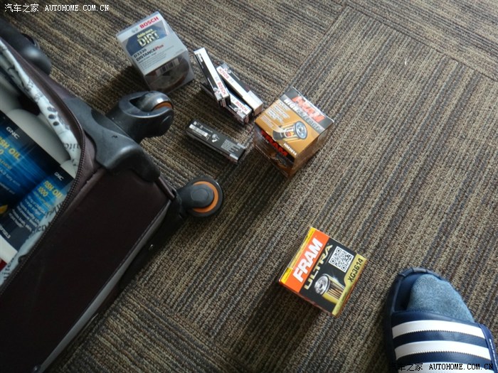 本人的脚丫子荣幸的被拍到了。。。国内带来的解放军01弹力袜,高弹、防臭、耐磨,居家旅行必备良品!我平时的袜子基本都是部队的袜子~除了运动时候才是较厚的毛巾袜。大箱子是国内某东买的不到300块买的29寸的大箱子,很不错~ 当然这张图的猪脚是三个机滤以及4个火花塞!机滤都是我在沃尔玛买的,见过上一个帖子的朋友肯定都见过的,我写了一些关于霸道保养得问题。这里就不说了~ 这里吐槽下老外的屋子总爱铺个这种地毯啥的,太不好打理了~当然,也有好处,唯一的好处就是手机掉地上没事。。。