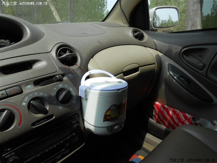 开车休息吃早饭时留个影,早饭是车里带的牛奶,面包火腿肠,把盒装的牛奶放到小电饭煲里,往电饭煲里加一点水,插上点烟器电源,20分钟牛奶就煮热了,
