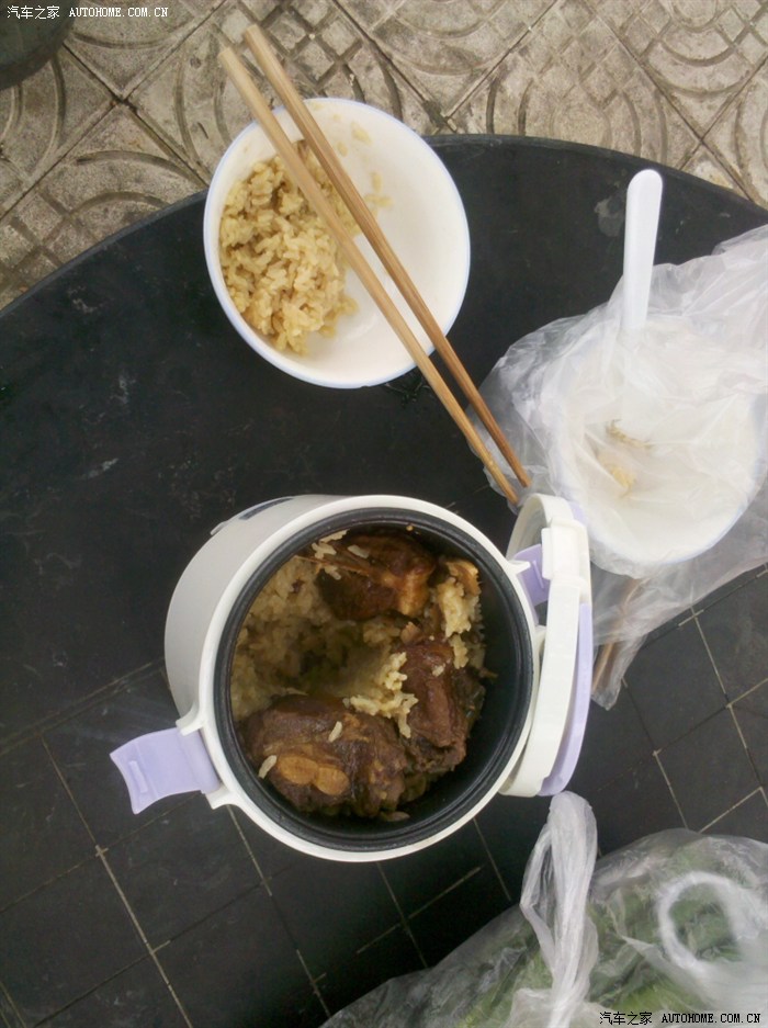 米饭是提前1小时把米放进电饭煲,加上水和在家做好的排骨,插上点烟器的电源,米饭熟了就开进休息区吃饭。2点离开洛阳休息区,因为困,3点多又在三门峡休息区休息一会,5点进入陕西潼关。