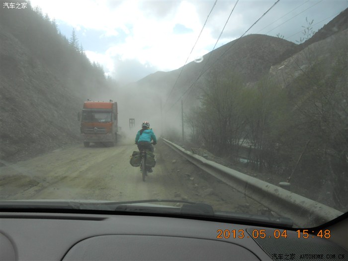 过了垭口,开始下坡,下到开隧道的地方(高尔寺山正在开挖隧道)路况变得差起来,有车经过,尘土飞扬,骑行者们在颠簸的路上艰难的穿行,我的车小,底牌低,也不敢开快,跟在几个骑行的后面,对面一过大车,飞扬的尘土立刻遮掩住了前面的骑行者,我不得不停下车,等尘土散去,才能看到前面的骑行者。