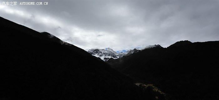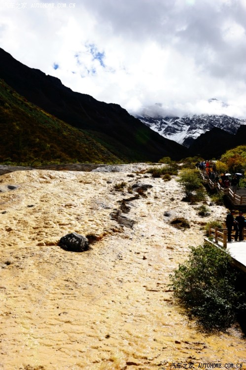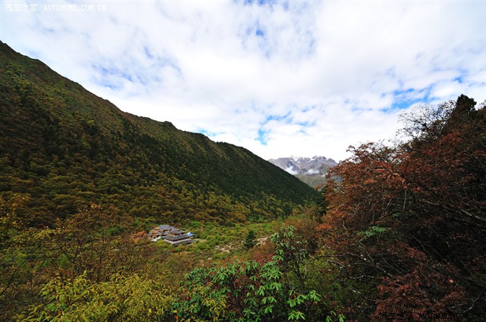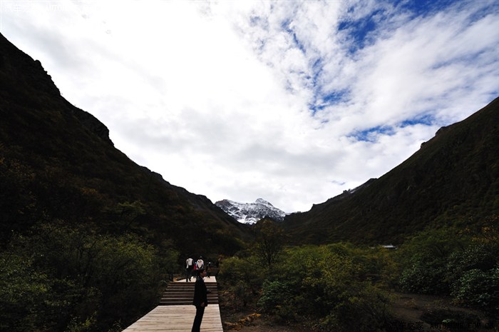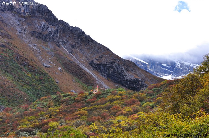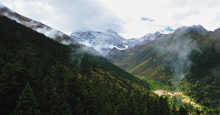 山谷中依稀可见的黄色山涧,还有山边那高耸威严的雪宝顶