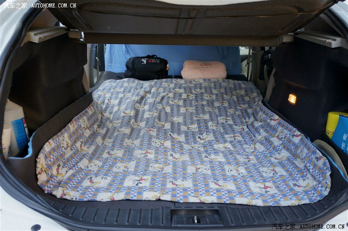 10、床的应用完全按照事先的准备。睡觉时把前排座推到最前面,床的长度就足够1.8米的人放倒了。