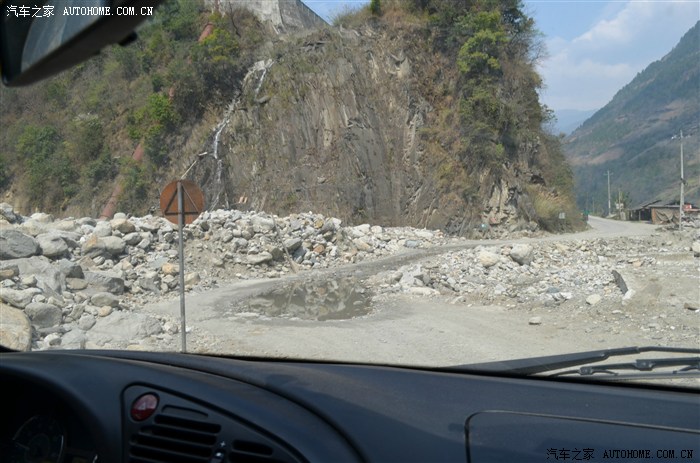 水毁路面,正在抢修,前面的水坑貌似很小,实则很深,而且水底都是鹅卵石,极滑