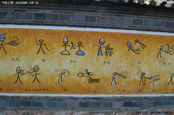 开车闲逛着走到了一个白沙壁画的景点,这是白沙壁画面口的墙上的东巴文字,这个真的很有爱!丽江古城里也有,建议大家学(xiao)习一下。以后当个暗号也是不错的。