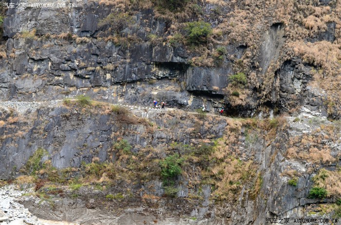 这就是茶马古道遗留的一段。是在岩壁上开凿出来的,正巧有村民经过,穿着古朴的民族服装,背着背篓。