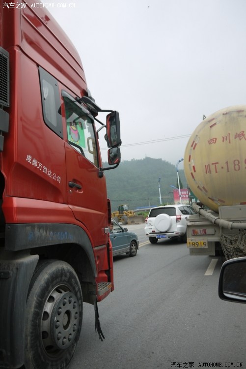 这是我们出雅江县城后遇见堵车,我们车后面的那辆坦途真大,发动机盖都快比我们车顶高了。