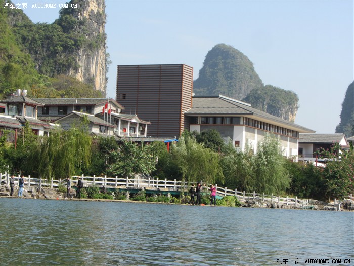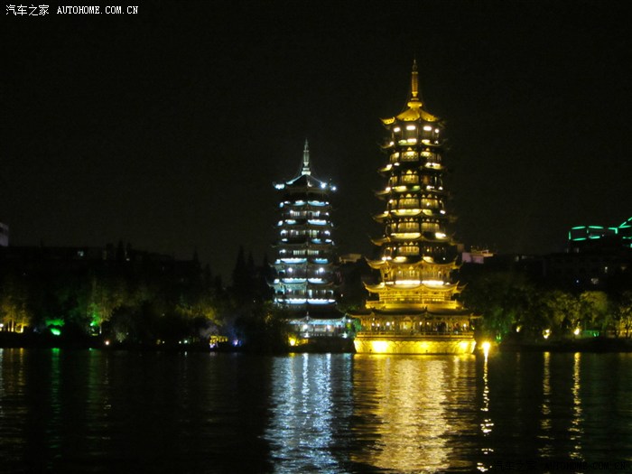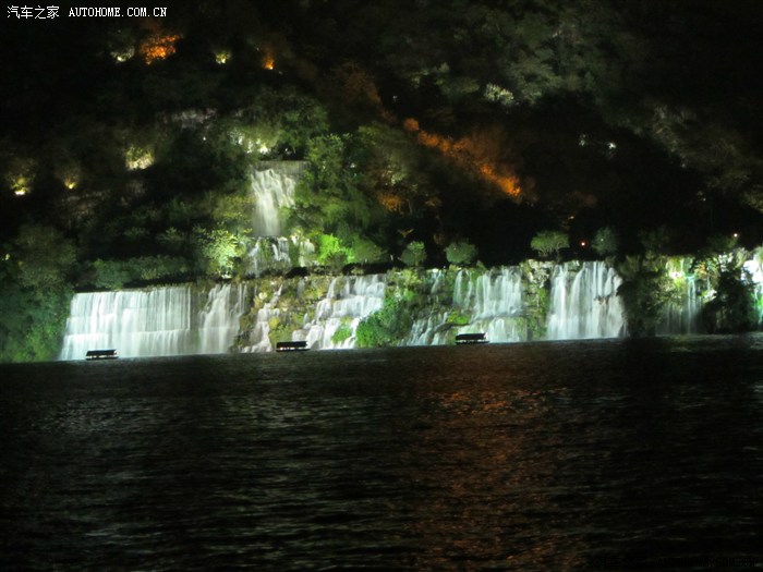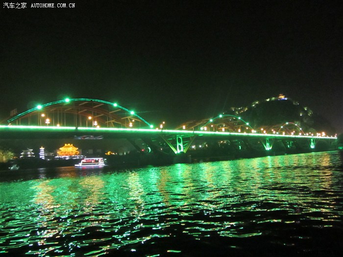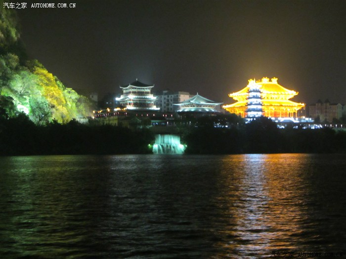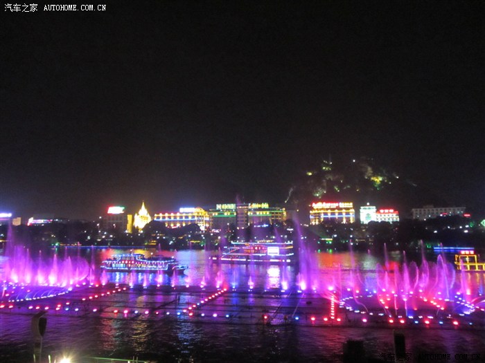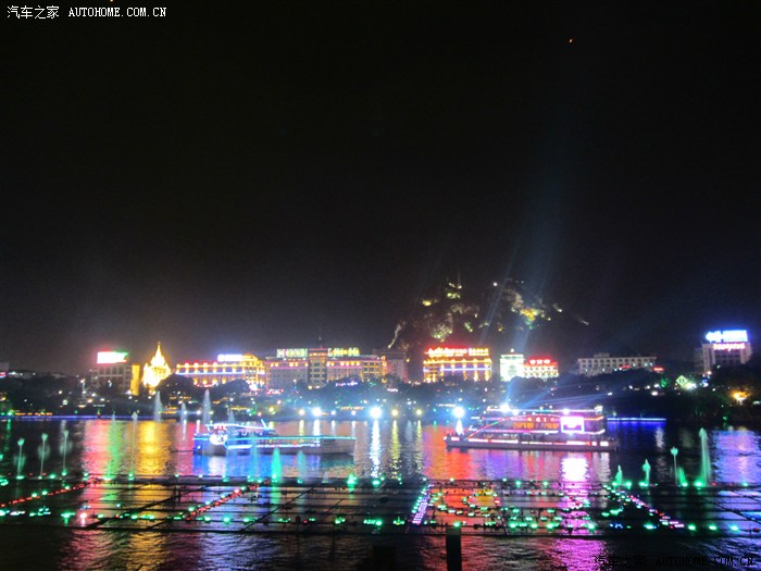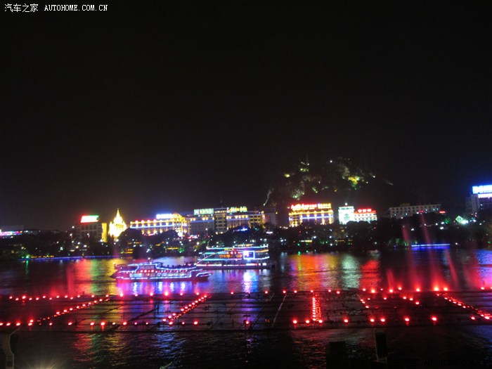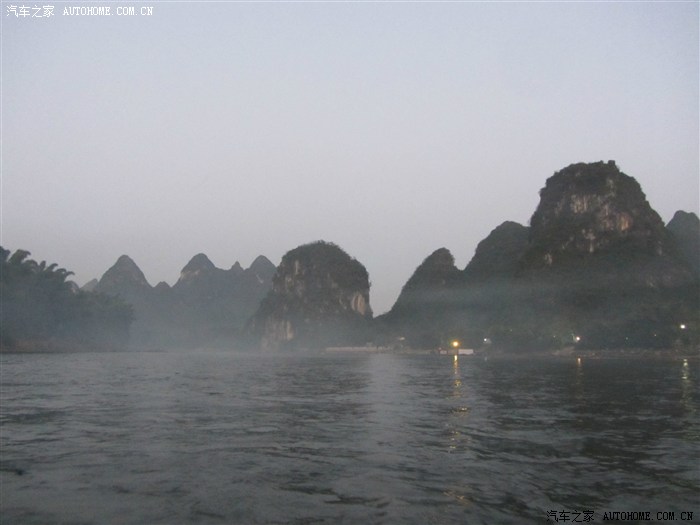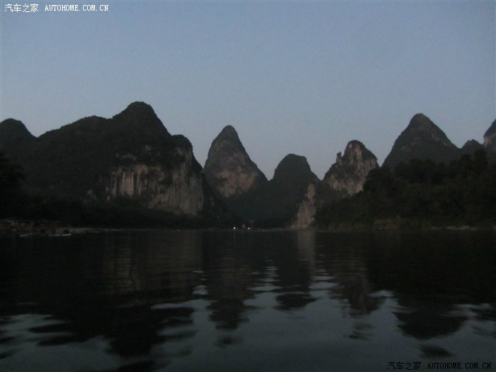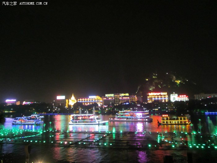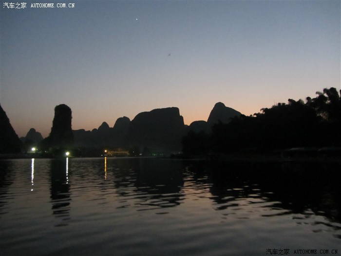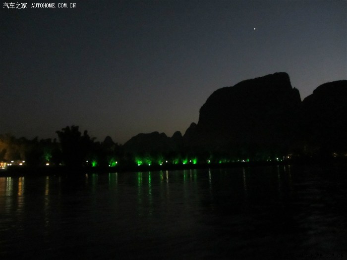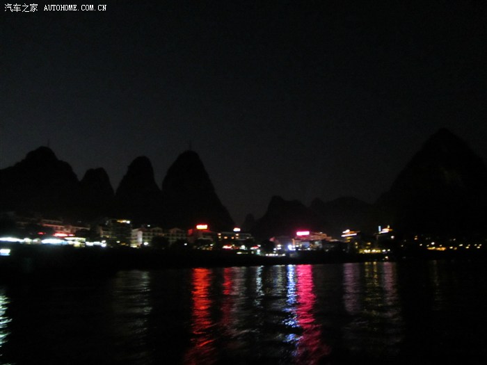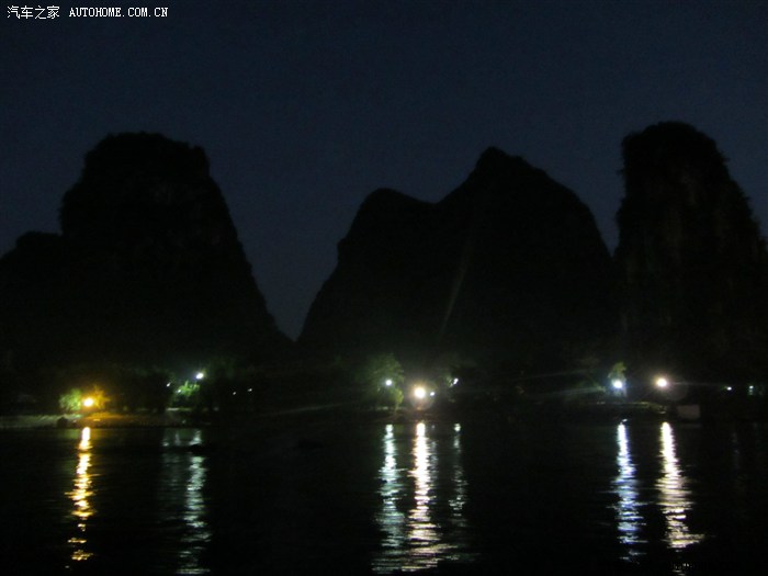 回程已全暗下来。灯火处是大型山水实景演出《印象·刘三姐》剧场。这里的水域连同作背景的12座连绵起伏山峰,组成世界最大的天然剧场。600名演员,时长70分钟,晚上八点开演。它以浅易的手法把刘三姐的山歌、广西民族风情和美妙的桂林山水融合在一体,创造出天人合一的艺术境界。张艺谋善用色彩、灯光、队列、歌舞、道具来营造梦幻一般的景象。也可以理解成山水风情恋爱版的奥运开幕式。剧中还有一裸女在月亮上跳舞哦。
