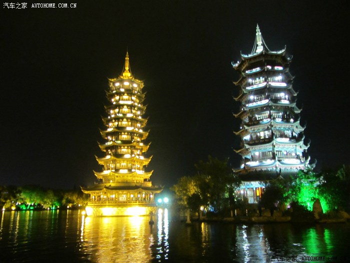 日月塔又称金银塔,是桂林市的文化地标,坐落于桂林日月双塔文化公园。日塔为铜塔,位于湖中心,高41米,共9层,月塔为琉璃塔,高35米,共7层。两塔之间以湖底一条10米长的湖底隧道相连。日塔荣获了三项世界之最:世界上最高的铜塔、世界上最高的水中电梯塔、世界最高的铜质建筑物。